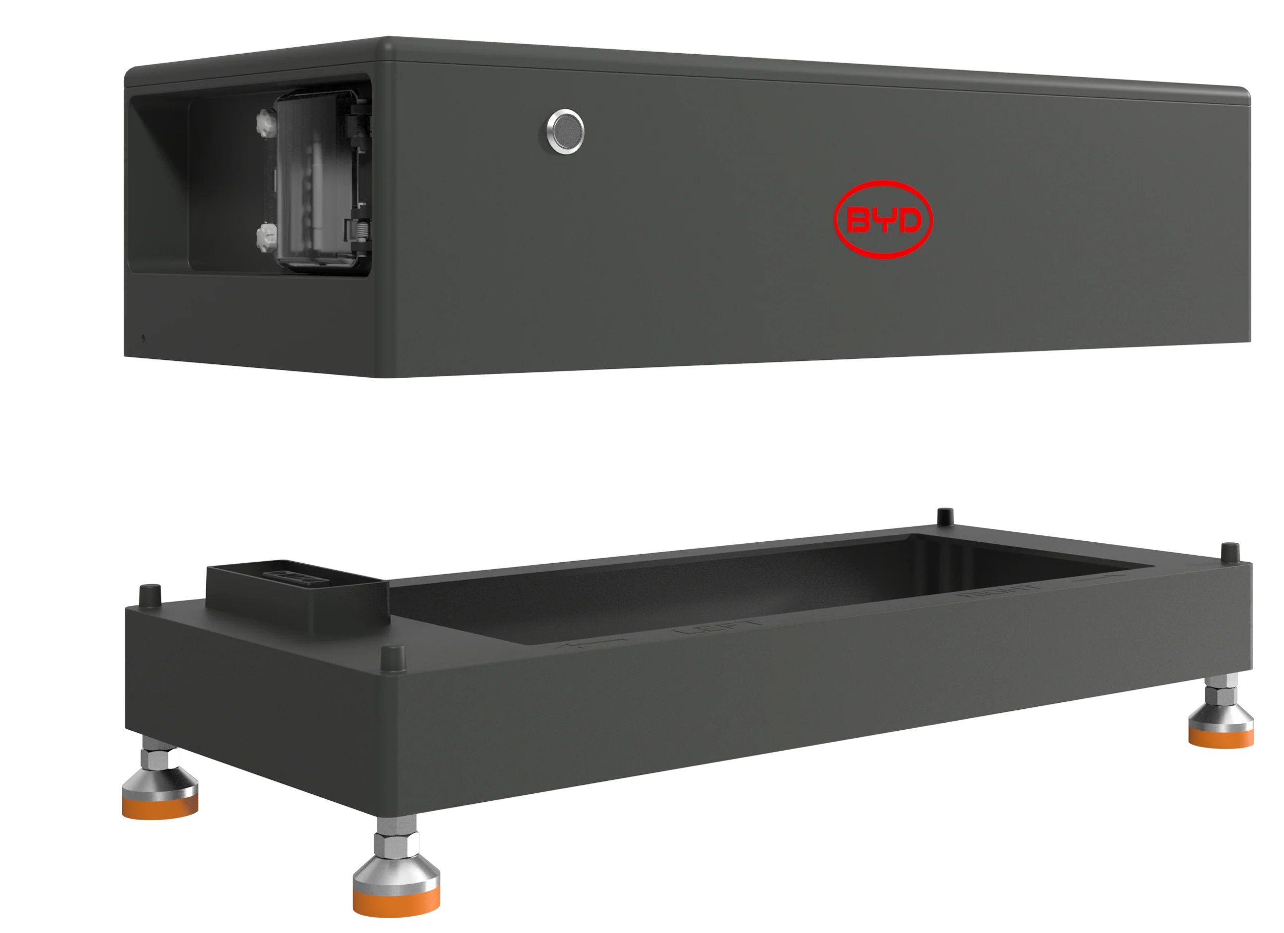 The BCU+ consists of the BCU (top), base and feet for BYD HVB, HVS+ and HVM+ modules. 1 BCU+ is required per tower.